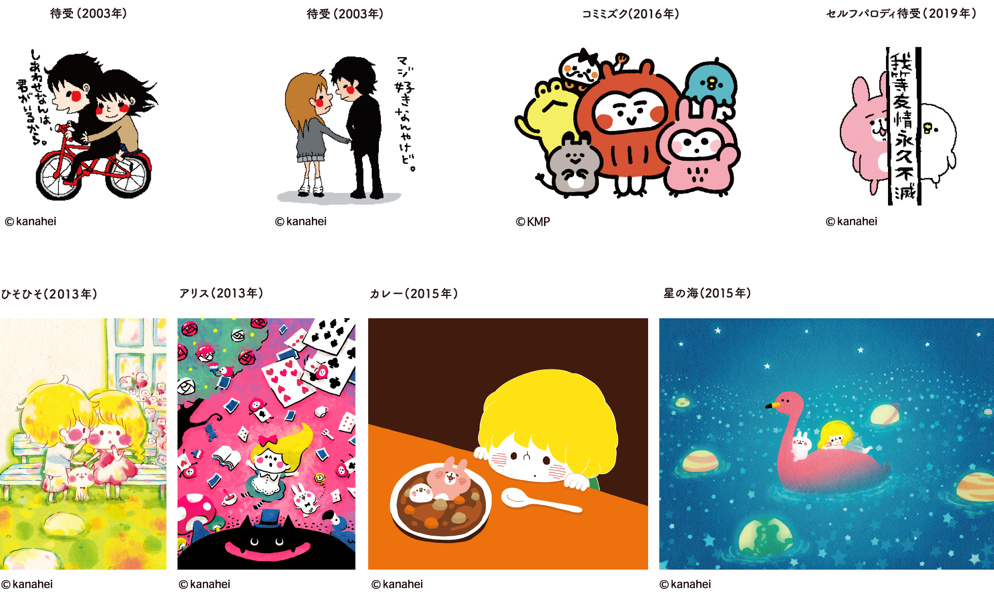 カナヘイ イラストレーター・漫画家。 自作待受画像の配信から全国でブームとなり、2003年にプロデビュー。 以降、漫画、育児エッセイ、LINE スタンプなど多様な媒体で幅広く活動を続け、20〜30代の男女を中心に多くのファンを持つ。「カナヘイの小動物」シリーズは国内外でグッズ展開されており、LINE Creators Stamp AWARD 2016 でグランプリを受賞、LINE Creators MVP AWARDではスタンププレミアム賞(2020年)を受賞。