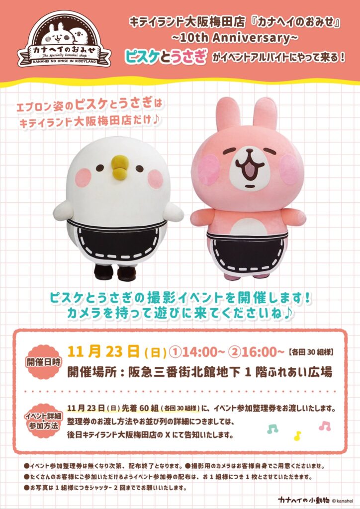 11/21 キデイランド大阪梅田店「カナヘイのおみせ」~10th Anniversary~ 開催!11/23 ピスケ&うさぎのグリーティングイベント!